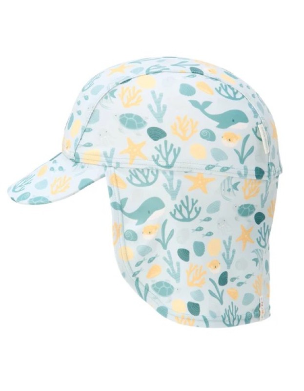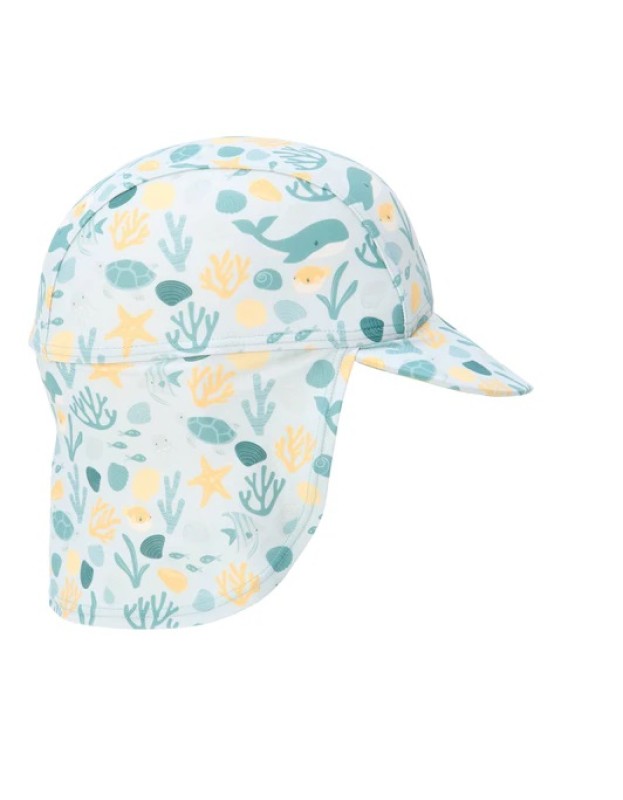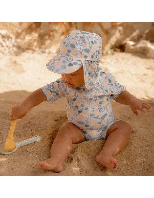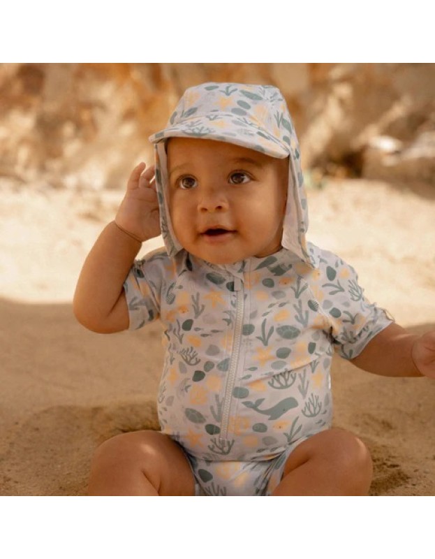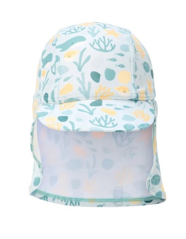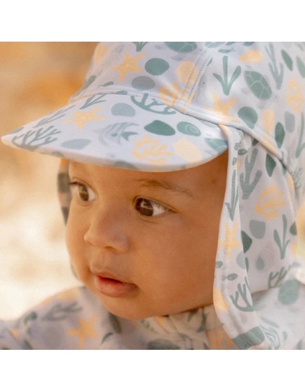 Оваа капа за пливање не само што обезбедува заштита од сончевите зраци, туку и ќе изгледате кул. Преклопот на вратот штити од изложување на сонце, додека на предната страна ќе ги штити очите и лицето од директна сончева светлина. Капата е изработена од ткаенина што брзо се суши и е совршена за часови играње во вода. Додека се капете во базенот или градите песочни замоци на плажа, вашето малечко останува заштитено и стилски во дизајнот Seashells and Stripes украсен со слатки китови риби и корали што пливаат низ светло сина вода.