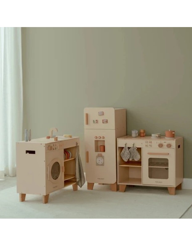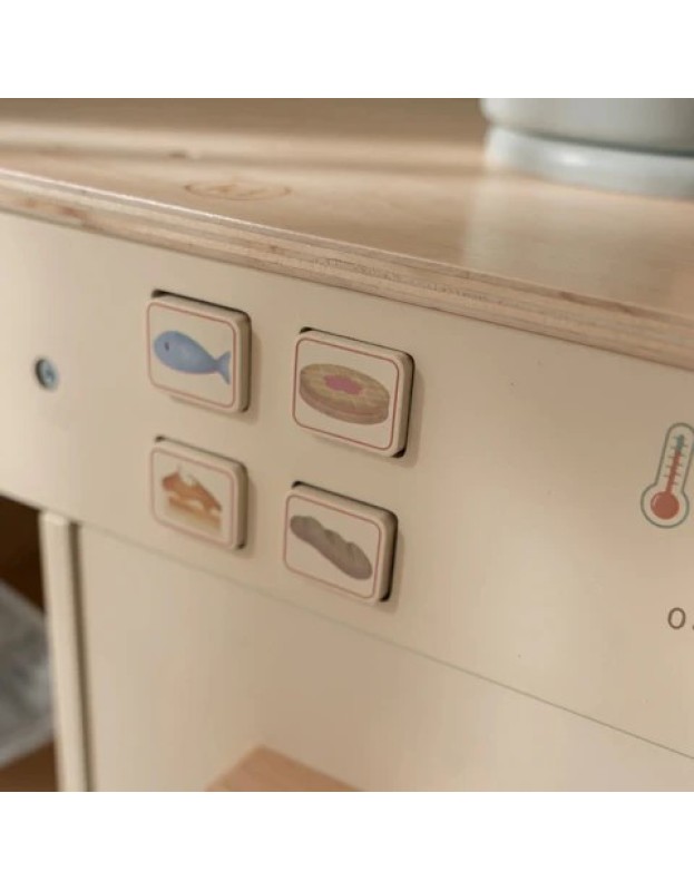 Оваа прекрасна дрвена станица за готвење е совршена за подготовка на највкусните оброци. Испечете торта во рерна или гответе свеж зеленчук на шпорет. Комплетот вклучува две тави, ракавица за рерна и држач за тенџере и е опремен со копчиња со илустрации за дополнителен реализам. Комбинирајте ја станицата за готвење со фрижидерот или со комплетот машина за перење и машина за миење садови за да создадете комплетна кујна за играње. Што има на менито денес?