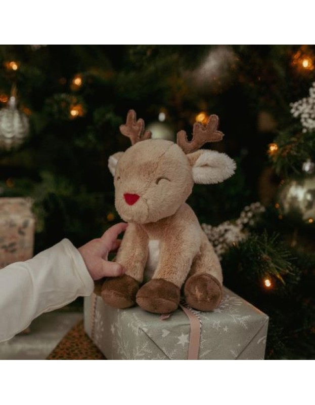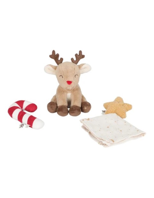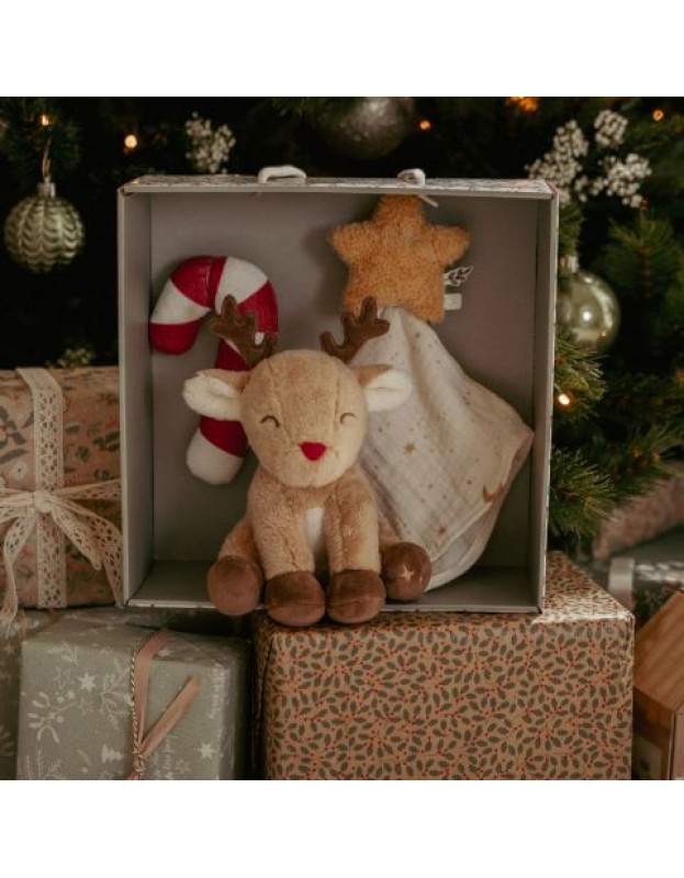 Овој прекрасен божиќен сет подароци содржи три пријатни придружници за гушкање, смирување и играње. Сместен во светла кутија за подароци, ќе откриете крпа за гушкање во облик на ѕвезда за нежни прегратки, ѕвечка од бонбони што ги поканува малите прсти да се фатат и тресат и преслатка плишана играчка од ирвас подготвена да стане првиот пријател за гушкање на вашето бебе.