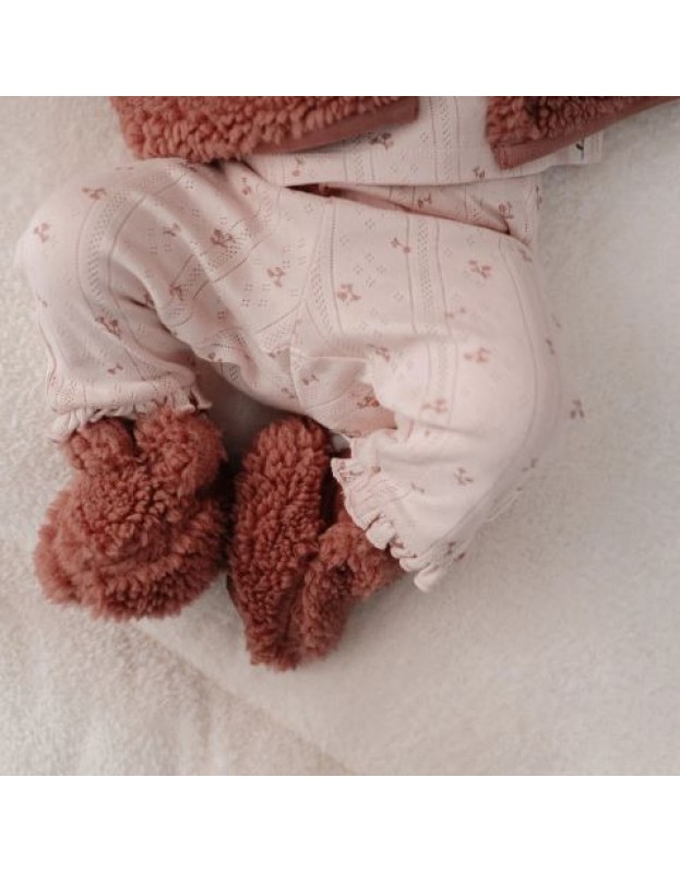 Дајте му на вашето малечко топли, удобни стапала со овие меки, најмеки топлинки зајче! Овие преслатки топлинки се изработени од прекрасно мек материјал во форма на меко зајче и се обложени со органски памук. Слатките зајачки уши и прекрасната нежна боја им даваат разигран изглед што вашето малечко ќе го обожава. Благодарение на удобните, ребрести и еластичните глуждови, совршено стојат на место. Комбинирајте ги со други производи од колекцијата за комплетен, мазен изглед од глава до пети. Достапни во две големини и тоа 1 (0-3 месеци) и 2 (3-9 месеци).