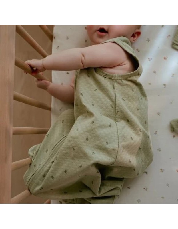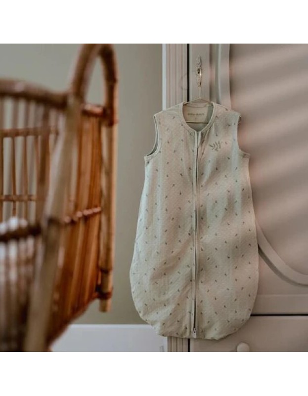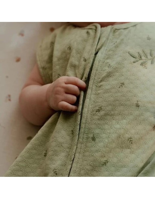 Во оваа вреќа за спиење во прекрасната боја Pure Sage со суптилен принт од лист и фин вез на градите, вашето малечко спие стилски и удобно. Изработена од луксузна, мека ткаенина од џерси жакард, се чувствува како вашето дете да е завиткано во облак - но без скокоткање. Совршена за добар ноќен сон, и за вашето бебе и за вас! Вреќата за спиење се затвора надолу, така што вашето дете не може лесно само да ја откопча. Има преклоп преку патентот за да се заштити чувствителната кожа на бебето. Вреќата за спиење е достапна во димензии од 70 см и 90см.