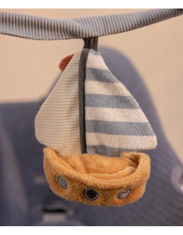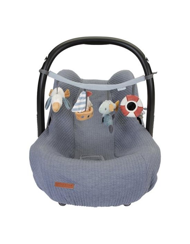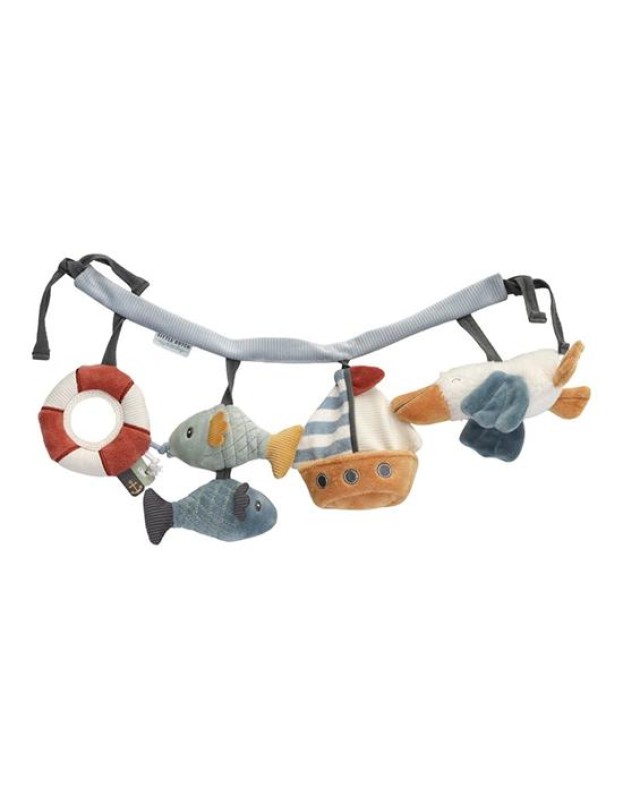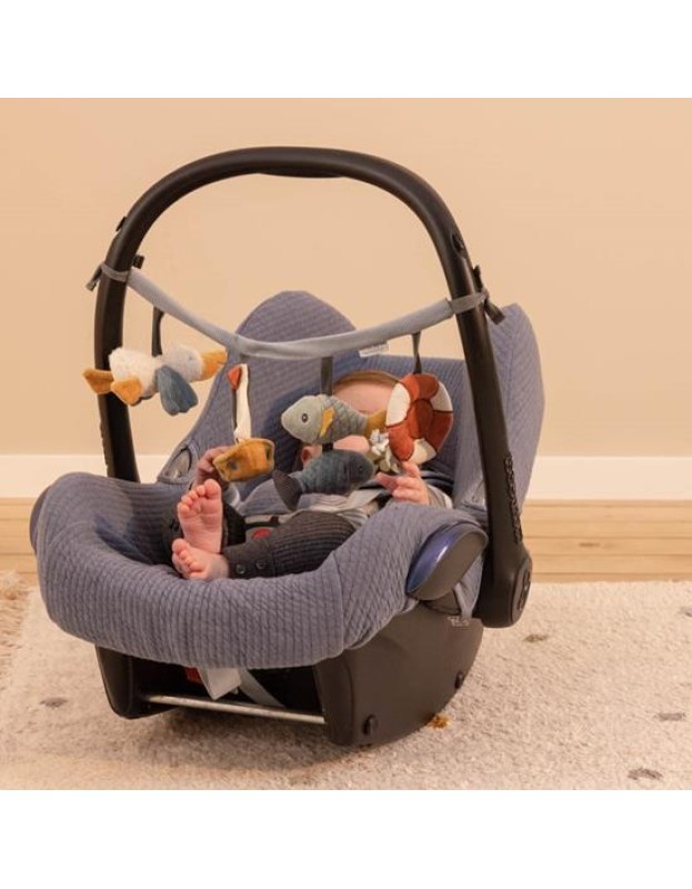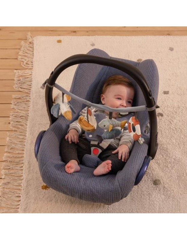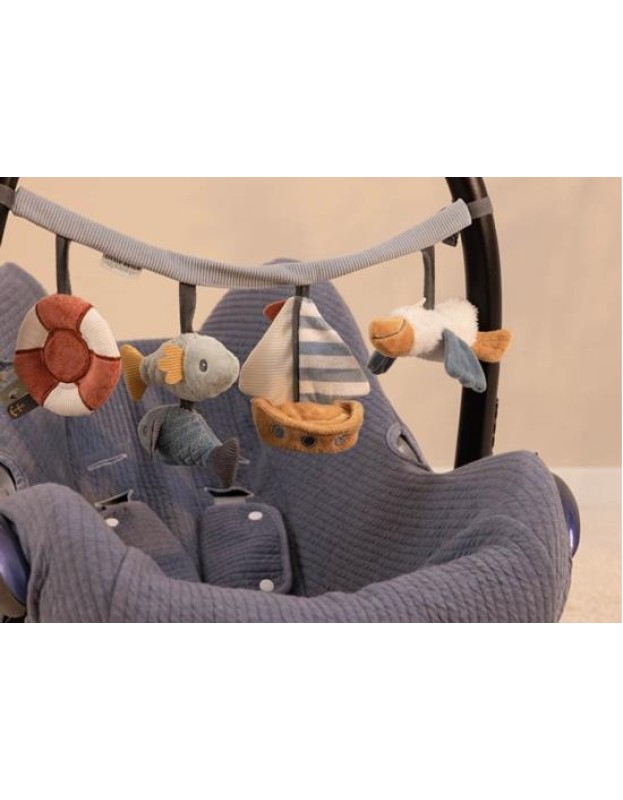 Нашиот синџир со активности за колички е одличен начин да го забавувате вашето малечко додека шетате. Се одликува со четири различни висечки играчки за гледање, за фаќање и за играње, вклучувајќи пеликан, едрилица, рибно дуо и огледало.