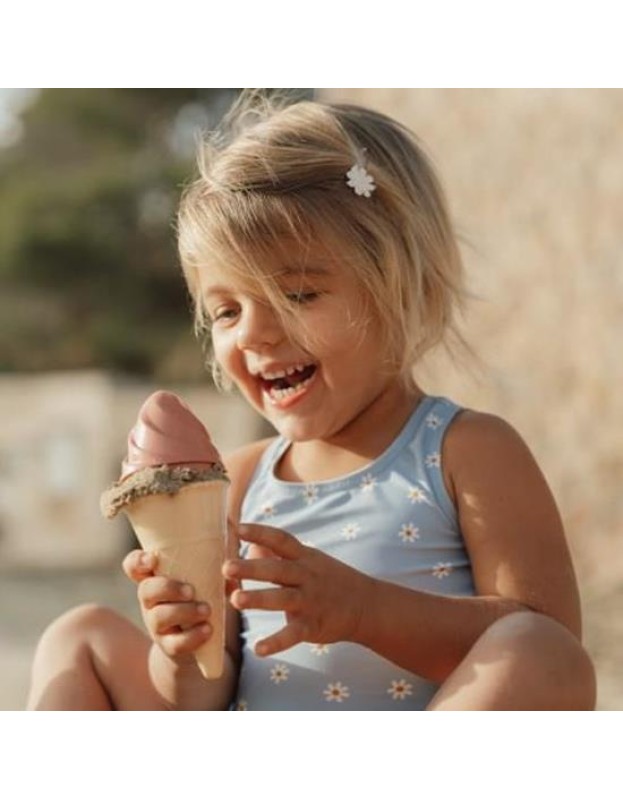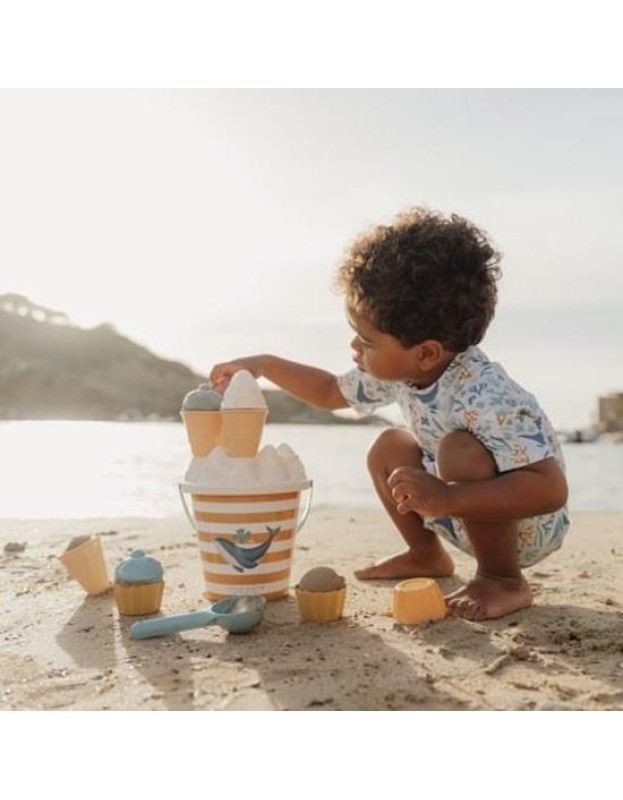 Ова е совршениот сет на играчки Ocean Dreams Blue за носење на плажа или песок. Гарантира часови забава и имагинативна игра. Со топката за сладолед и 4 калапи, вашето малечко ќе наполни бескрајни корничиња и чаши со сладолед со вкус на песок за сите наоколу. Кофата го олеснува држењето на комплетот заедно, но помага и при носење вода, а со затворен капак ги држи подготвените корничиња сладолед, спремни за послужување.