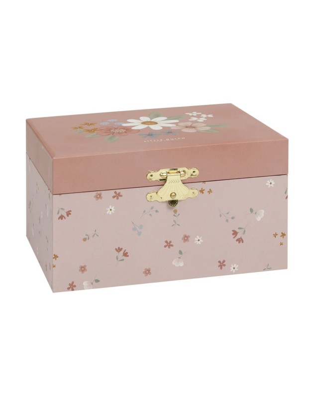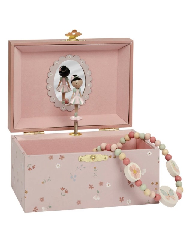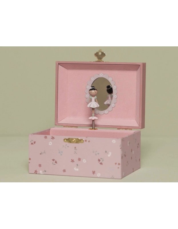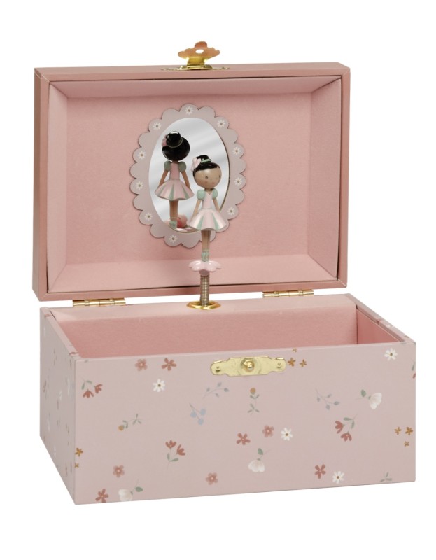 Внатре во оваа прекрасна музичка кутија е балерината Еви која нестрпливо чека да ја покаже својата балеринска пируета! Украсена е со нашиот принт Little pink flowers и има мало огледалце во форма на цвет.