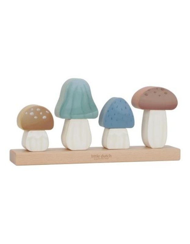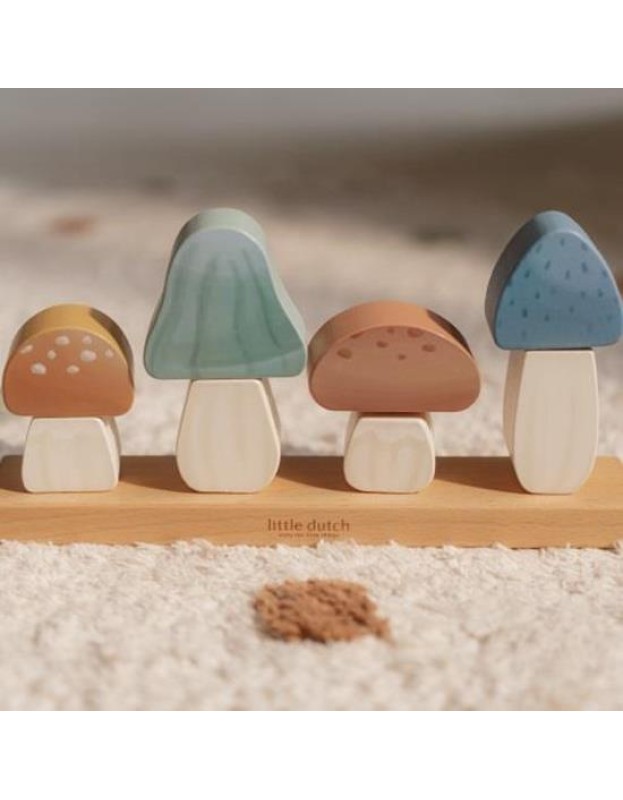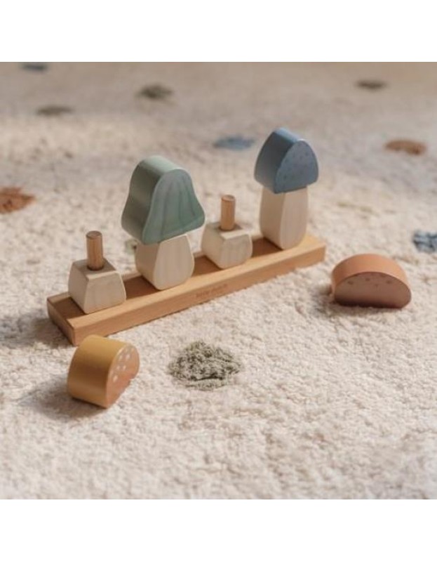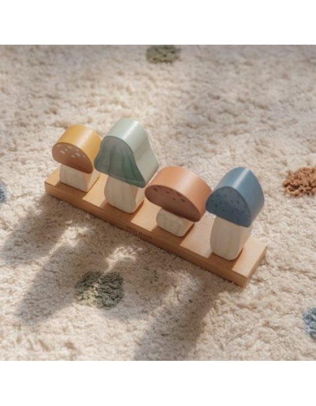 Ајде заедно да изградиме шума од печурки! Измешајте ги и спојте ги блоковите и создадете ред од четири волшебни печурки од колекцијата Forest Friends. Ставете ги блоковите на држачот еден по еден и вежбајте ја координацијата рака-око. Забавна загатка за играње и учење редење која исто така е прекрасен украс во детската соба.
