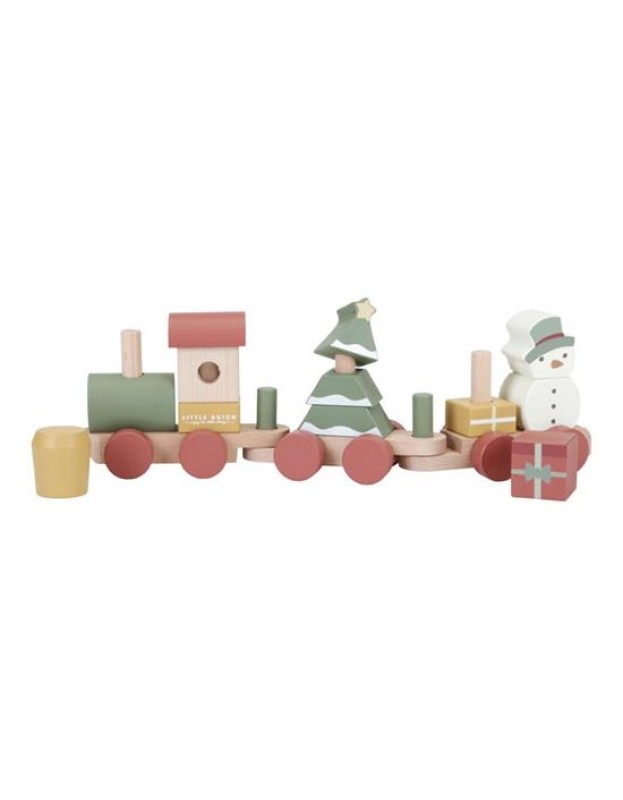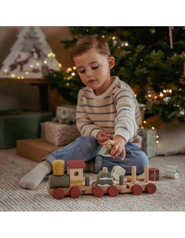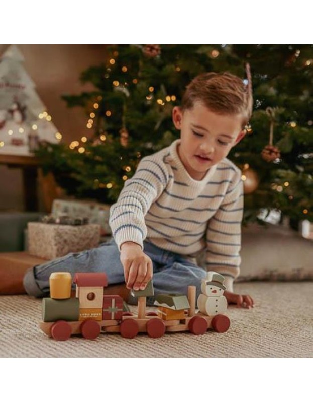 Ајде сите во Божиќниот воз! Дали ќе помогнете сите деца да ги добијат своите подароците? Снешкото веќе влезе во возот. Користете ги различните форми на градежни блокови за да изградите новогодишна елка во вагонот. Овој воз сложувалка ќе ја подобри координацијата рака-око на вашето малечко и ќе ги стимулира неговите фини моторни вештини.