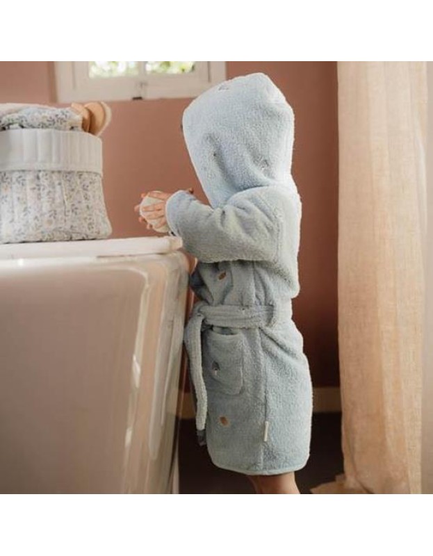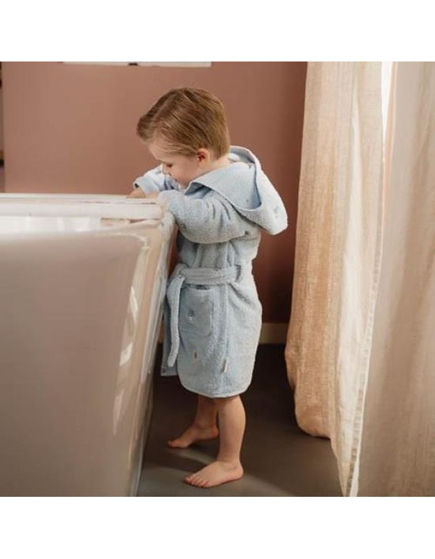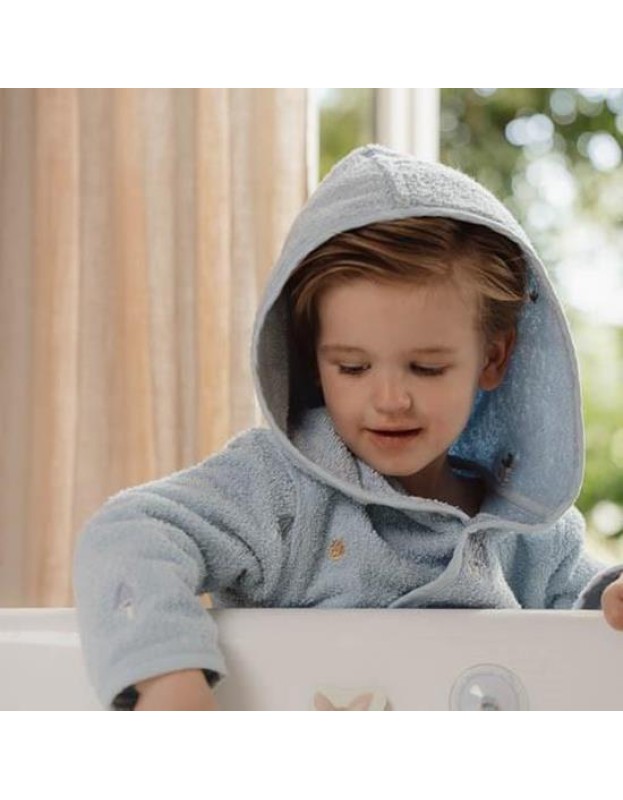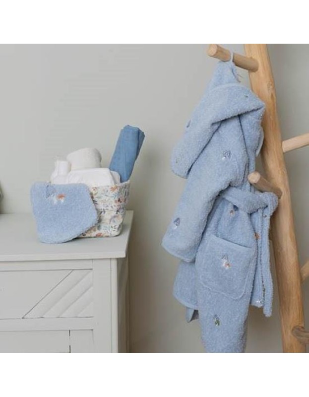 Нежно прегрнете го вашето малечко во утешната обвивка на оваа бањарка и негувајте ги овие драгоцени моменти на топлина и блискост по разигран ден. Изработена од 100% органски памук, оваа бањарка нуди неверојатна мекост и апсорпција. Совршенa е за вашето дете да се чувствува пријатно и суво по бањата. Бањарката е дизајнирана со безбеден ремен за половината и стратешки поставено копче за прицврстување, обезбедувајќи и слобода на движење и пријатна топлина за вашето малечко. Прекрасната сина бањарка е украсена со шармантен вез од колекцијата Forest Friends, со прекрасни мали печурки со волшебниот дух на шумата.