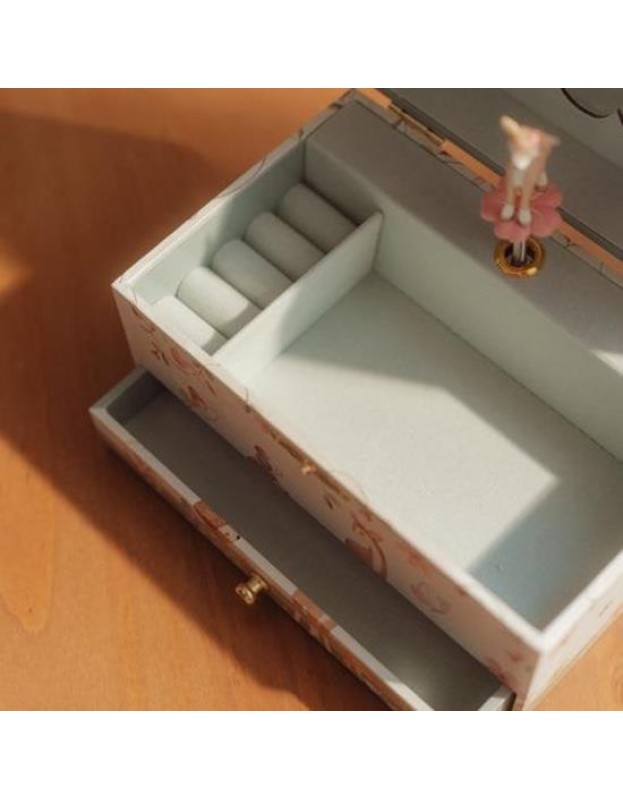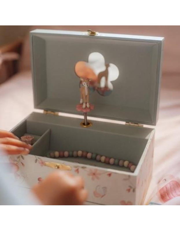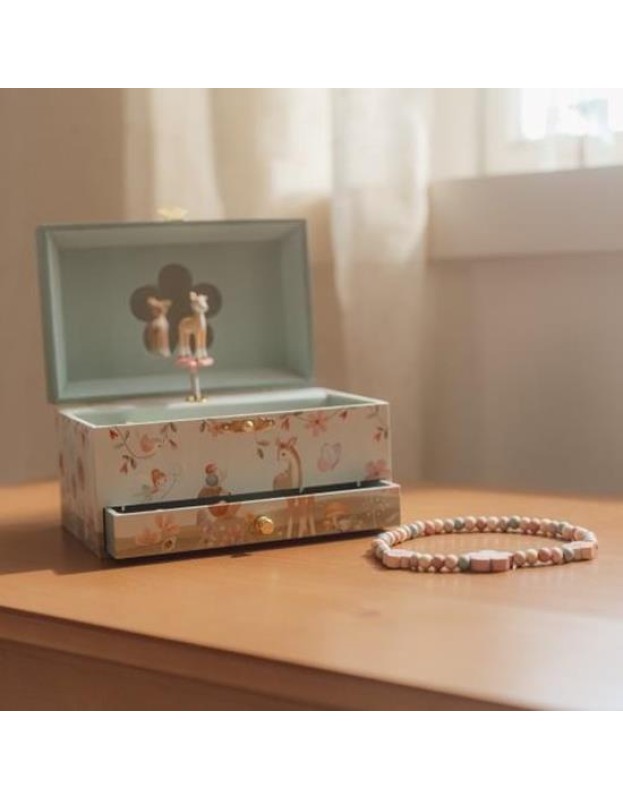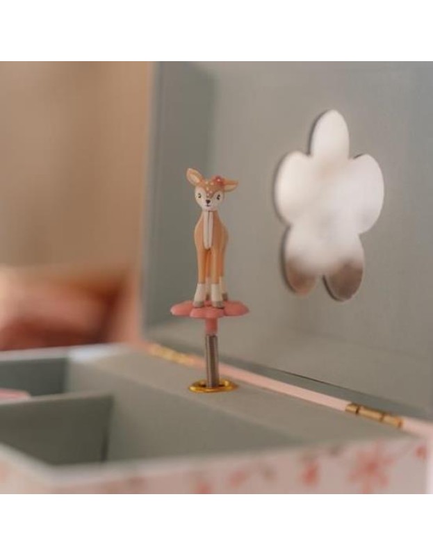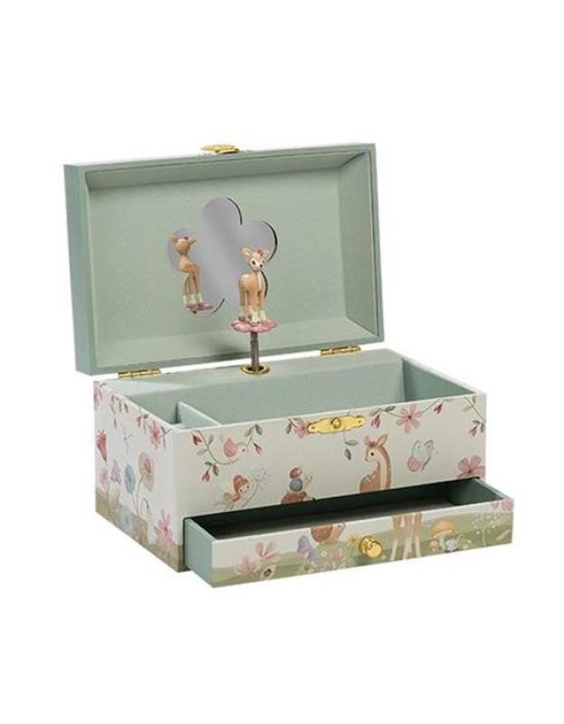 Внатре во оваа прекрасна музичка кутија е малата срничка која нестрпливо чека да ја покаже својата балеринска пируета! Украсена е со нашиот принт Forest Friends и има мало огледалце во форма на цвет.