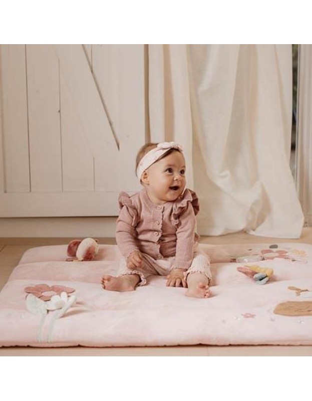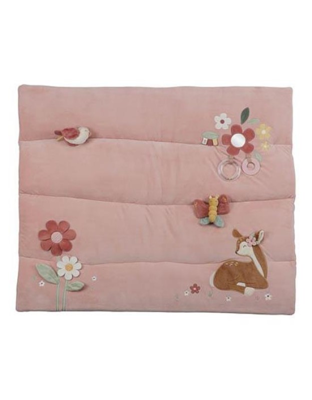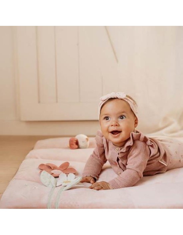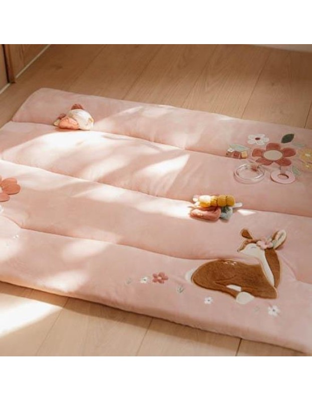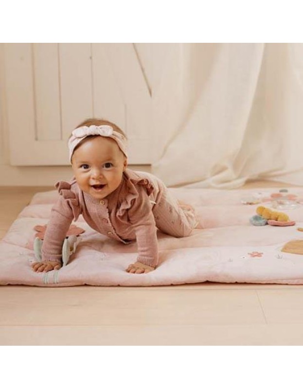 Потопете се во магијата на самовилската градина на оваа преслатка розова простирка за играње. Има многу што да откриете и да видите! Одете во авантура за да ги пронајдете крцкавите лисја, да го запознаете прекрасниот мек елен и да си играте со пеперутката и малата птица. Има и мало огледало за самоистражување и проѕирен прстен со три мали монистра кои штракаат кога се движат. Оваа подлога за играње разиграно ги стимулира сетилата на вашето дете со различните текстури и активности.