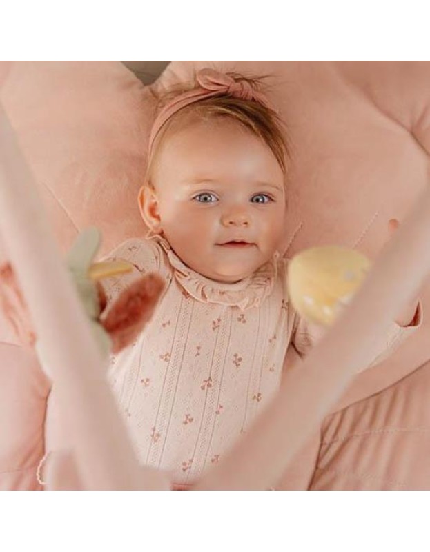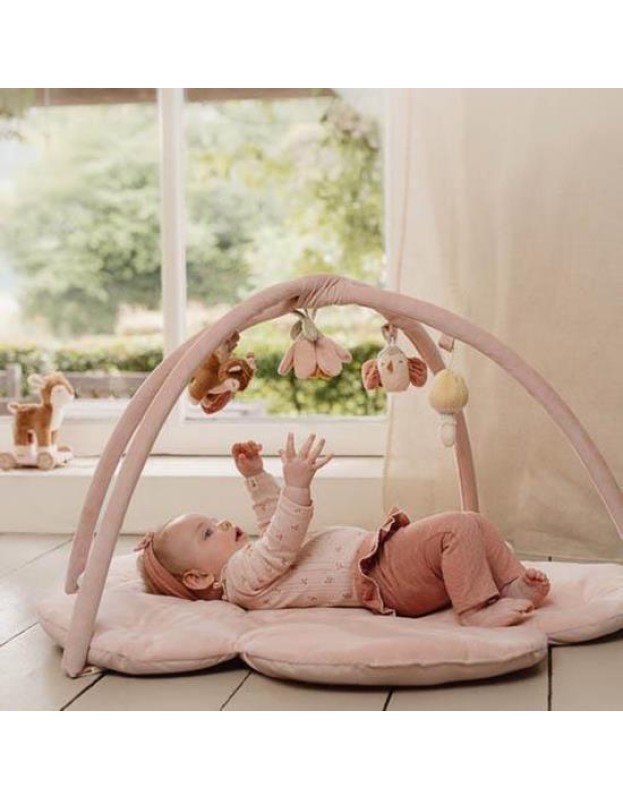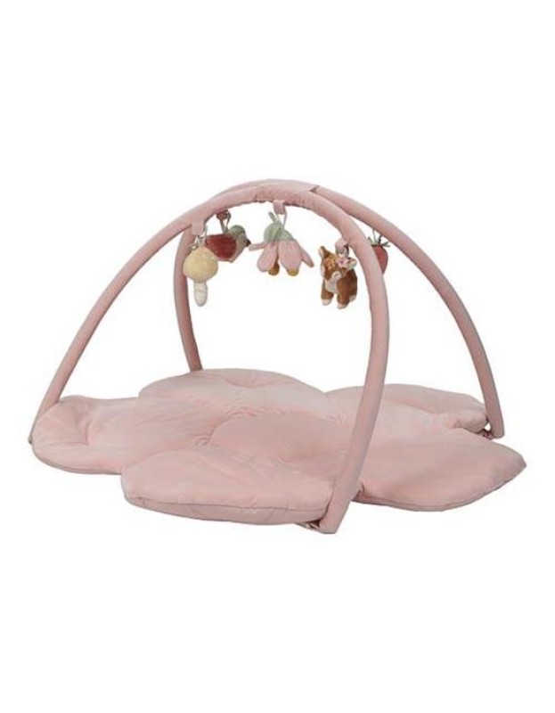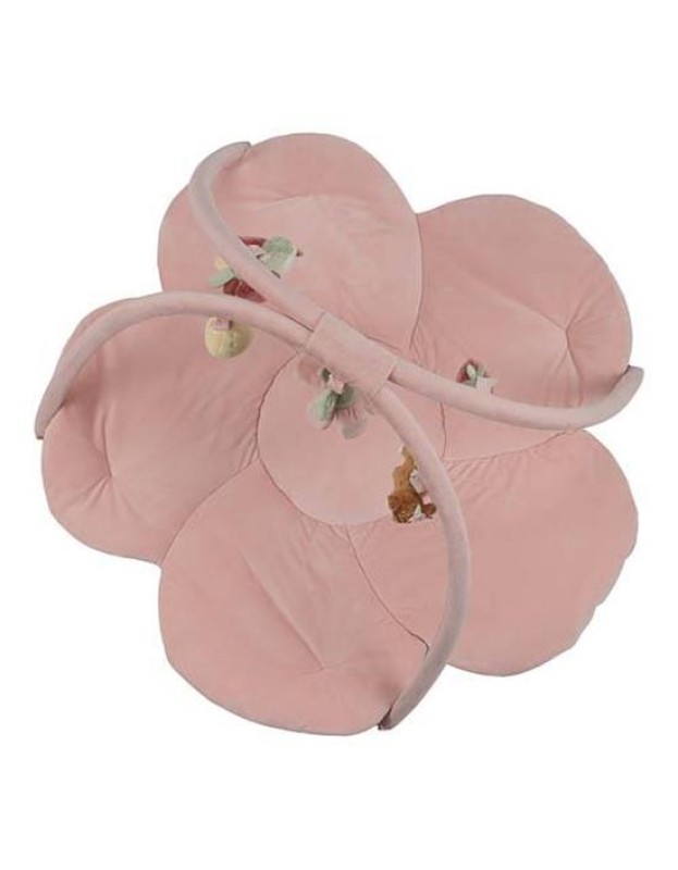 Толку многу да се види, да се допре и да се слушне! Секој ден е авантура со оваа подлога во облик на цвет. Изведено во нежно розев тон, има два сомотски лакови со пет различни висечки меки играчки од колекцијата Fairy Garden. Малата срничка, птица, цвет, печурка и јагода ќе помогнат да се развијат сетилните вештини и координацијата рака-око.