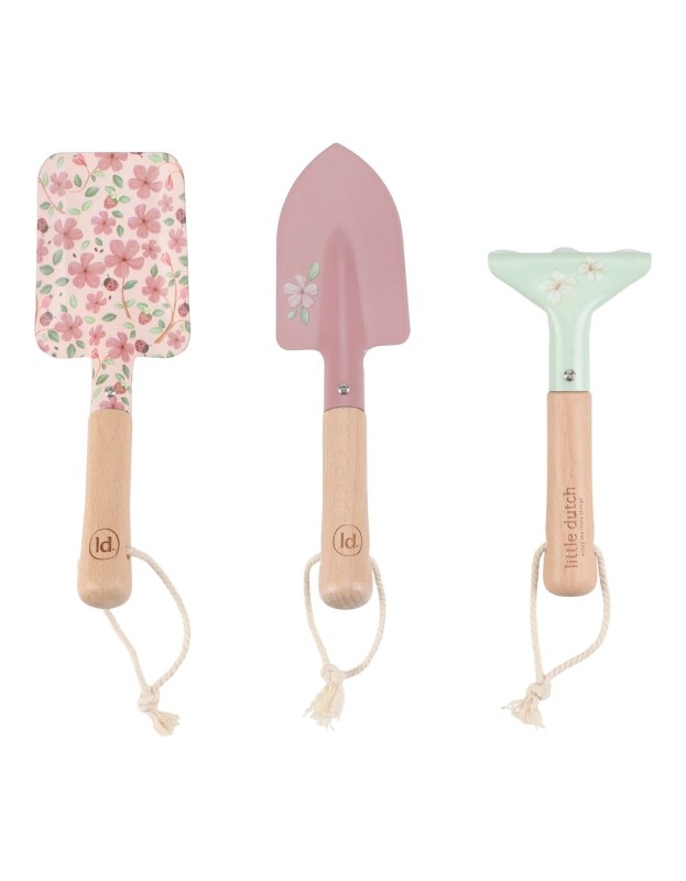Комплетот се состои од две мали лопатки и гребло, сите изработени од цврст метал со дрвени рачки за удобно држење. Секое парче е украсено со прекрасни илустрации и бои од колекцијата, совршено прилагодени на авантурите на вашето малечко во градината. Со практичните жици можете лесно да ги закачете алатите по градината.