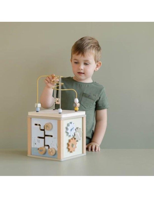 Оваа дрвена коцка за активности обезбедува многу предизвици за децата.
