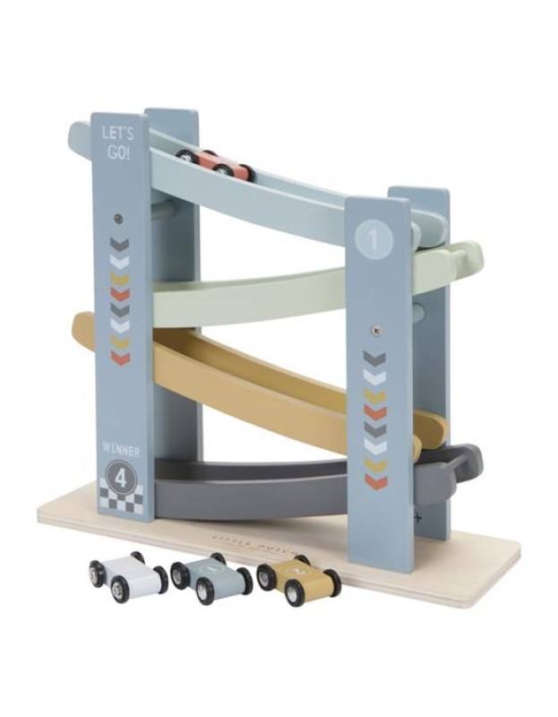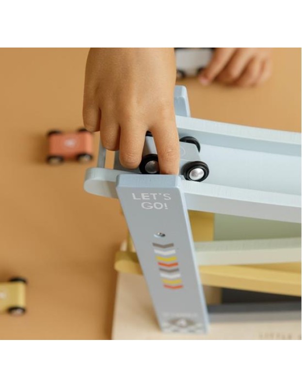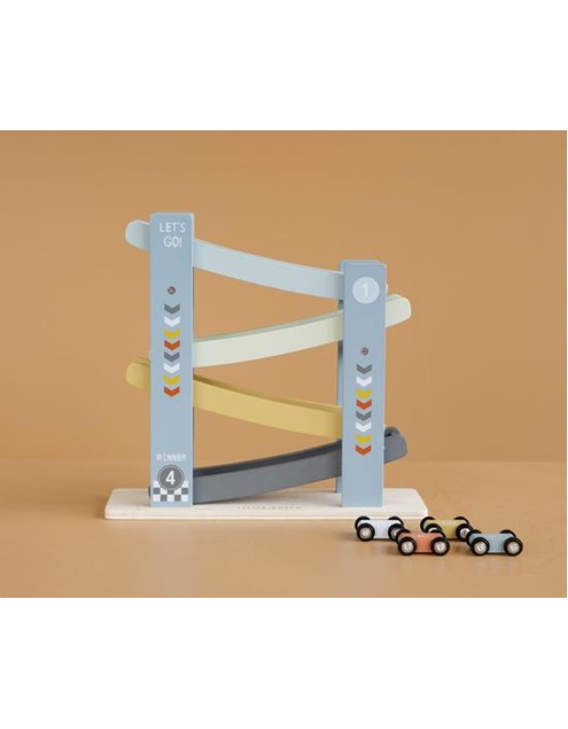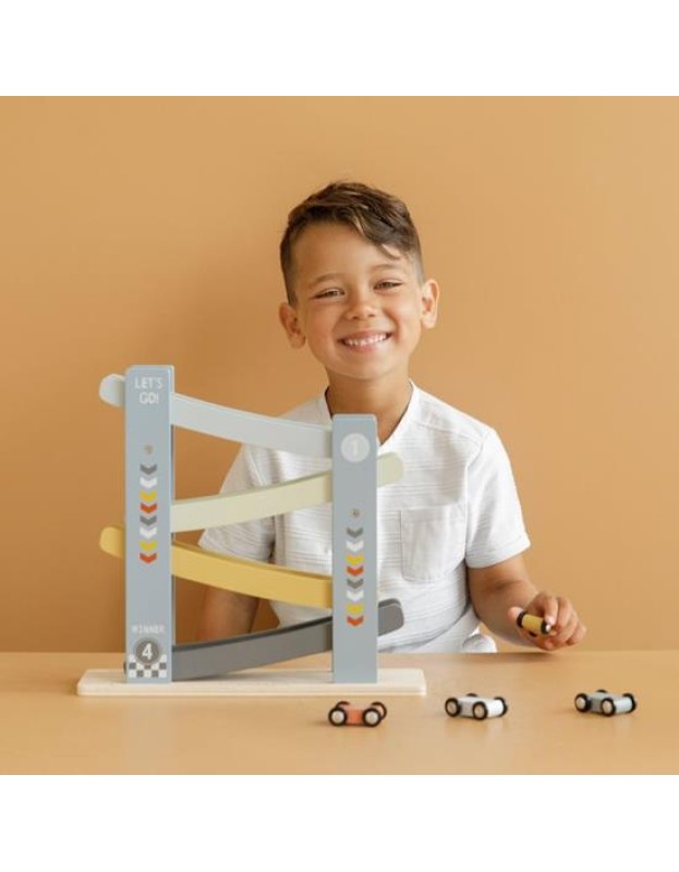 Поставете ги автомобилите еден по еден на врвот на тркачката патека и пуштете ги, тие ќе се тркаат надолу.