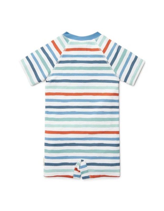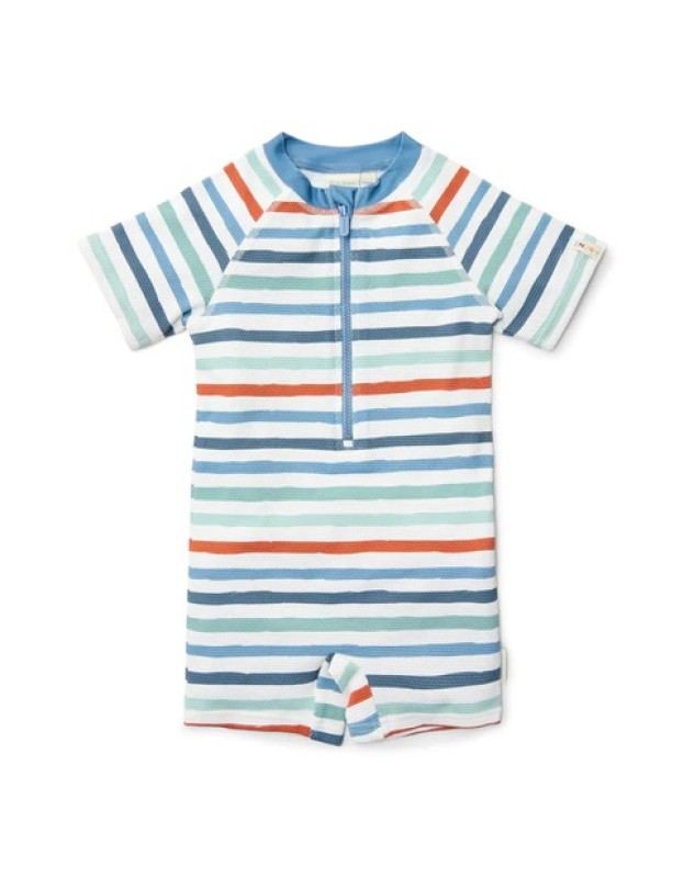 Без разлика дали ги сакате брановите или градите замоци од песок, со ова одело ќе изгледате како најкул сурфер на плажа. Овој костим за капење со кратки ракави го држи вашето малечко топло во водата и го штити од сонцето. Веселиот дизајн со школки и пруги се одликува со хоризонтални пруги во летна палета на бои. Спортски, но сепак модерен, совршен за денови полни со забава покрај вода. Предниот патент овозможува лесно облекување и соблекување, дури и кога вашето дете е влажно и песочно.Направен од рециклиран полиестер, овој костим за капење е достапен во големини 62/68, 74/80, 86/92 и 98/104.