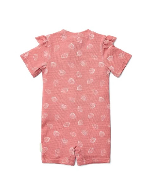 Дизајнот во лимонада-розова боја е украсен со шармантен принт од бели школки, создавајќи разигран и имагинативен изглед што евоцира чувство на чудење и авантура. Предниот патент го олеснува облекувањето и соблекувањето на вашето малечко, без разлика дали е влажно или песочно. Наборите на рамената се инспирирани од движењето на брановите и додаваат допир на шарм на костимот за капење. Достапен во големини 62/68, 74/80, 86/92 и 98/104. Надополнете го изгледот на Ocean Treasures со шапка за сонце и чевли за капење. Секогаш запомнете да користите крема за сончање за да го заштитите вашето малечко.