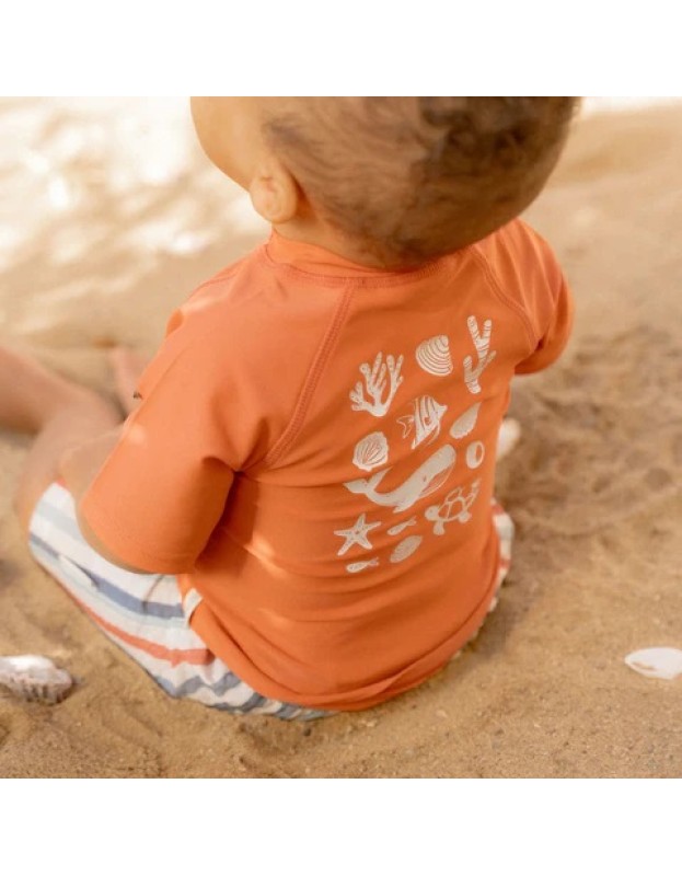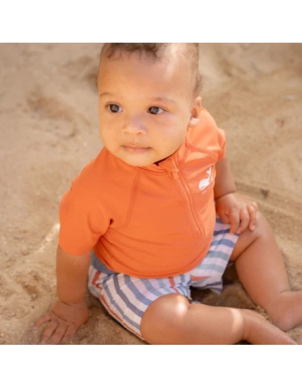 Дополнете го изгледот на со маица за капење и соодветна капа. Не заборавајте да понесете крпа и секогаш користете крема за сончање за да му обезбедите на вашето малечко максимална заштита.