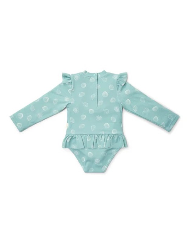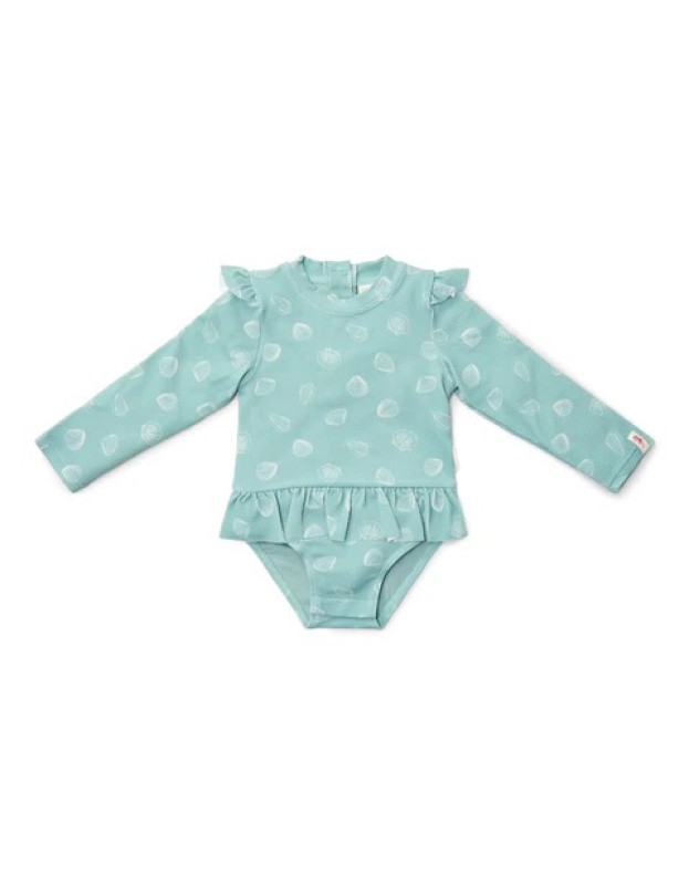 Со овој прекрасен костим за капење, ќе се воодушевите како најслаткото сурферско девојче на плажа. Затоа, земете го вашиот лонгборд и да се упатиме кон брегот. Овој сладок костим за капење со долги ракави има прекрасна основа во боја на мента зелена, украсена со шармантен принт од бели школки, создавајќи имагинативен изглед. Наборите на рамената и шармантното наборено здолниште му даваат на костимот за капење сладок и разигран изглед. Практичното затворање со копчиња на грбот го олеснува облекувањето и соблекувањето, дури и кога вашето малечко е влажно и песочно. Костимот за капење е достапен во четири големини.