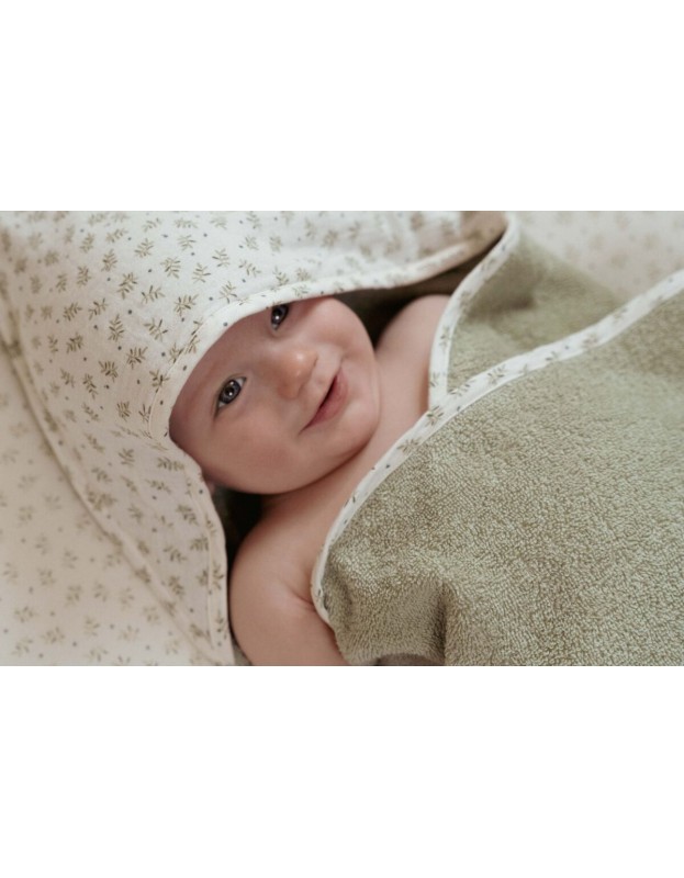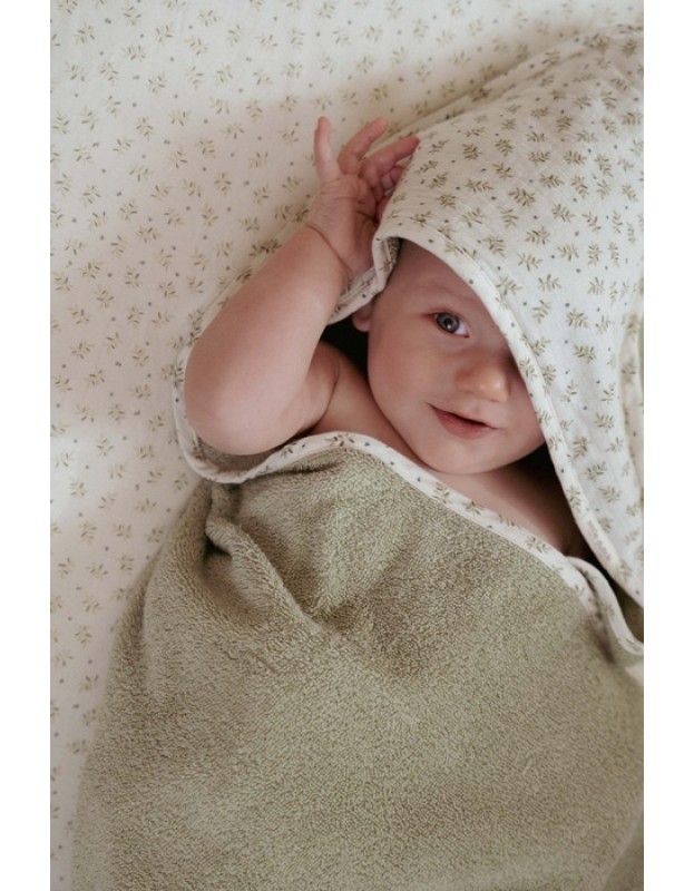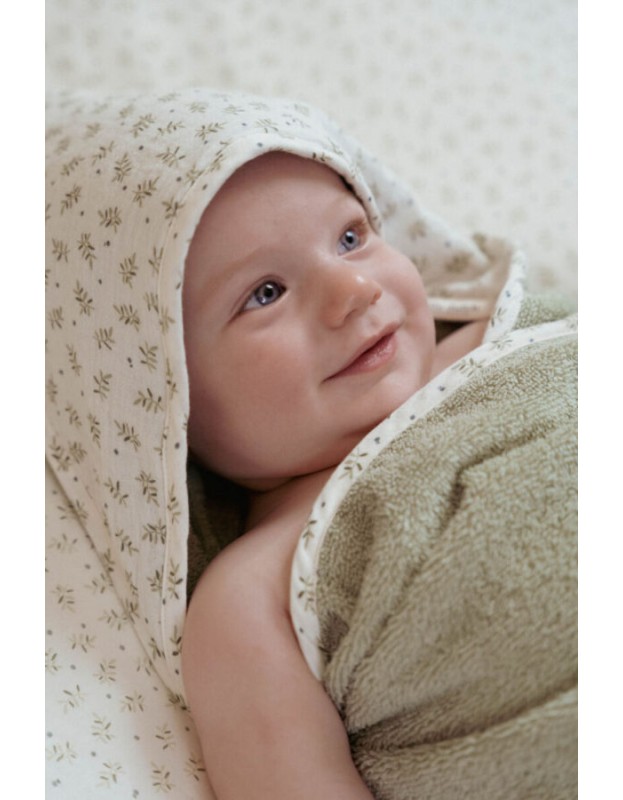 Завиткајте го вашето малечко во топлина и мекост со овој пешкир со качулка. Направено од 100% органски памук, се чувствува меко и нежно на нежната кожа на вашето дете. Дизајниран за практичност и шарм, меката капа од муслин го обвиткува вашето малечко, обезбедувајќи топлина и удобност по секое капење. Пешкирот има прекрасна зелена боја, а капата е украсена со преслаткиот дезен на Blueberry Leaves.