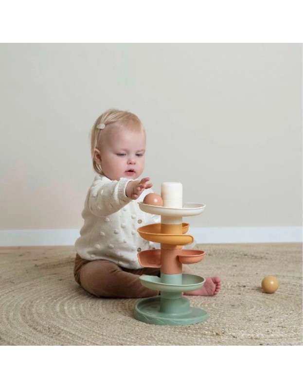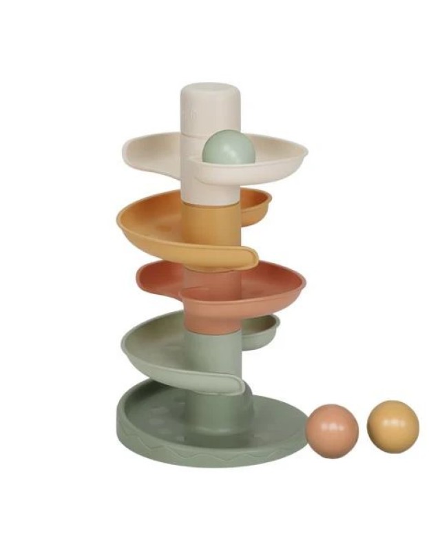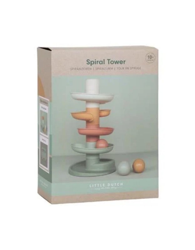 Оваа фасцинантна спирална кула создава бескрајна возбуда. Шарената играчка се состои од 5 парчиња во меки нијанси што вашето малечко лесно може да ги реди една врз друга. Спуштете ги топчињата едно по едно на горниот слој и видете како секое од нив се навива и тркала надолу. Спиралната кула ја подобрува координацијата рака-око и го учи детето на концептот на причина и последица, осигурувајќи дека е и забавно и едукативно. Спиралната кула доаѓа со три големи топчиња што лесно се фаќаат во различни бои кои испуштаат мал звук кога се движат.