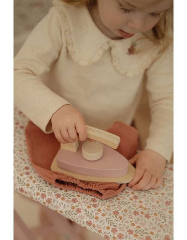 Пеглајте како големите! Со оваа прекрасна дрвена даска за пеглање и соодветна пегла, најмалите можат уредно да ја пеглаат облеката на своите кукли или плишани играчки. Даската се преклопува, што ја прави лесна за складирање. Совршен додаток на играње улоги и одличен начин да ги откриете домашните работи преку игра!