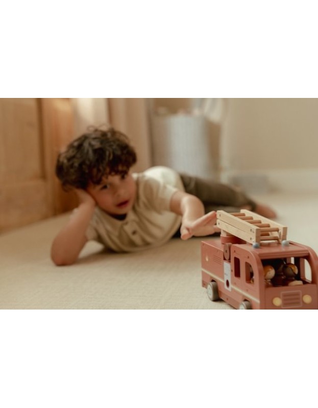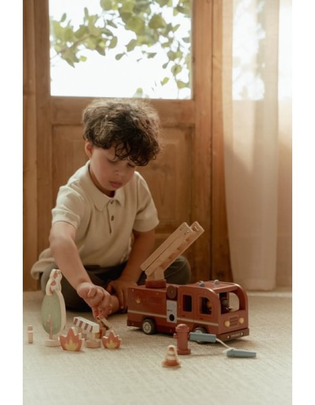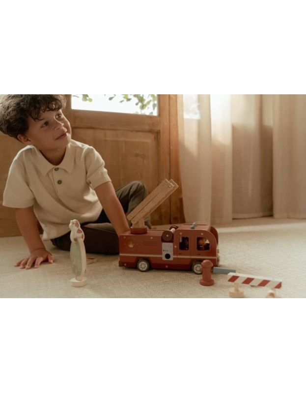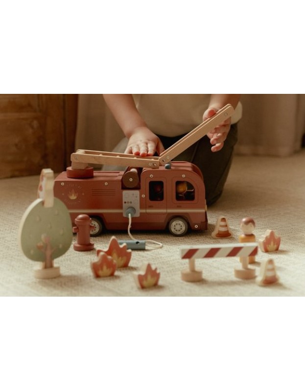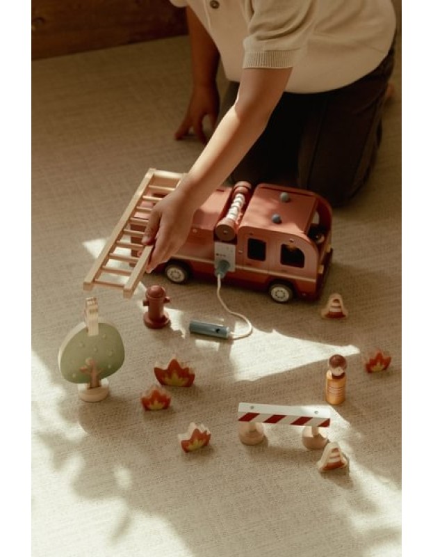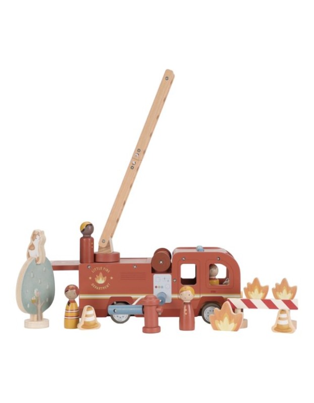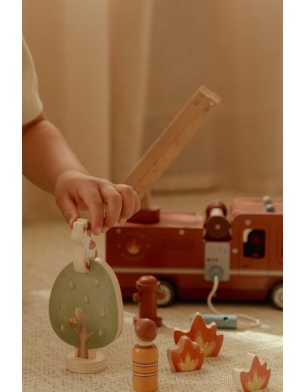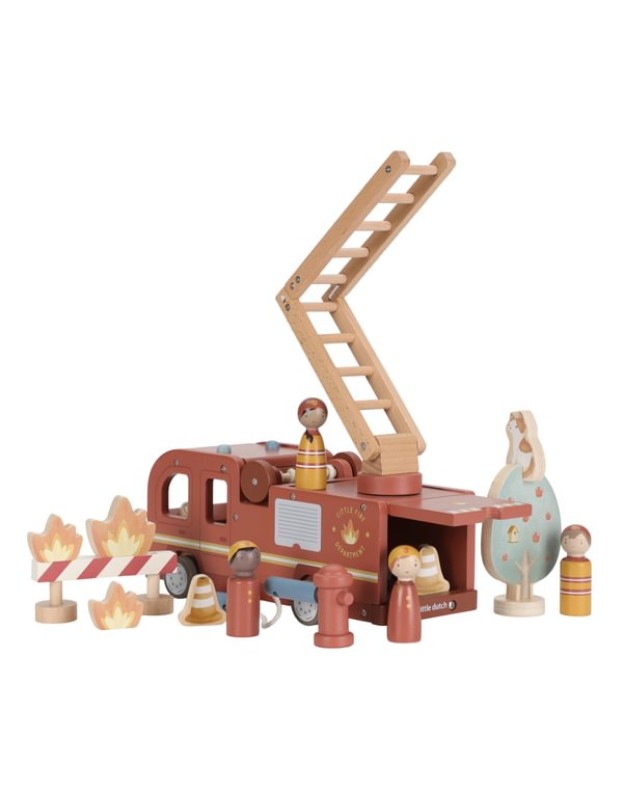 Ова дрвено противпожарно возило има скали што може да се прошират и црево што може да се одвои што може да се поврзе со хидрантот или противпожарното возило. Вклучува четири пожарникари, пламени и хидрант. Идеално за комбинирање со противпожарната станица за уште поголема забава со игра!