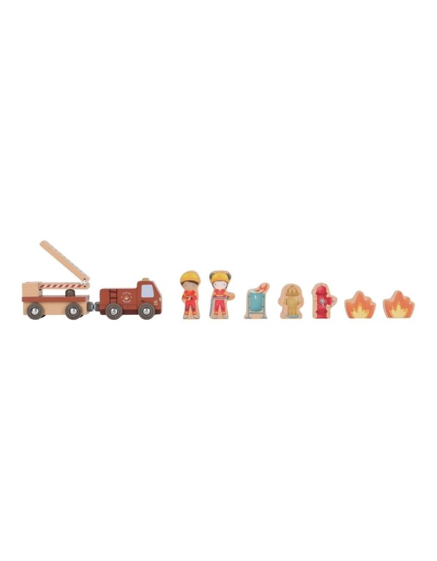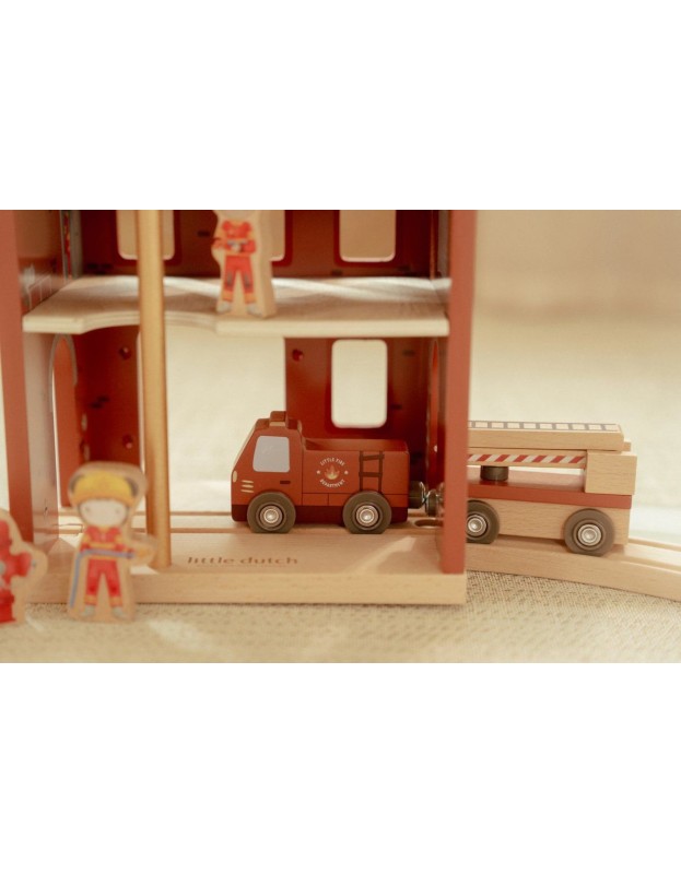 Алармот ѕвони! Оваа дрвена противпожарна станица има сè што ви треба за возбудлива мисија за спасување. Отворете ги вратите, лизгајте се надолу по противпожарниот столб и скокнете во противпожарното возило. Вклучува пожарникари, пламен и запалена корпа за ѓубре. Вратите на станицата можат да се отворат, што ви овозможува брзо да реагирате. Комбинирајте го овој сет со дрвените железнички пруги XL за уште поголема авантура. Кого ќе спасите денес?
