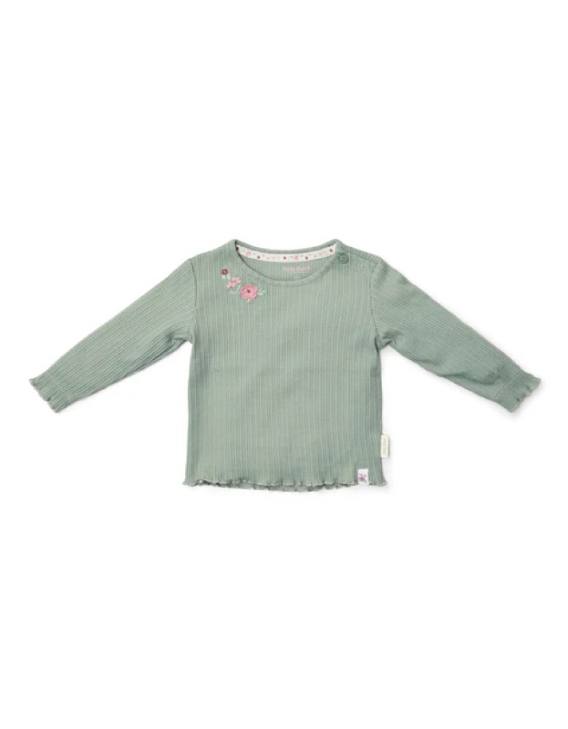Комбинирајте стил и удобност со оваа ребреста блуза во прекрасна зелена боја. Изработена од 100% органски памук, оваа блуза е прекрасно мека на кожата. Контрастните шевови на долниот дел и слаткиот цветен вез ѝ даваат разигран изглед. Комбинирајте ја оваа маица со убави панталони или здолниште и дајте му на вашето малечко трендовско освежување! Достапна во големини од 74 до 104.