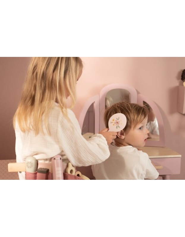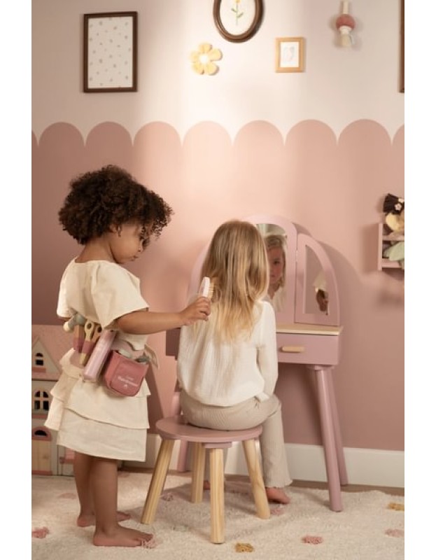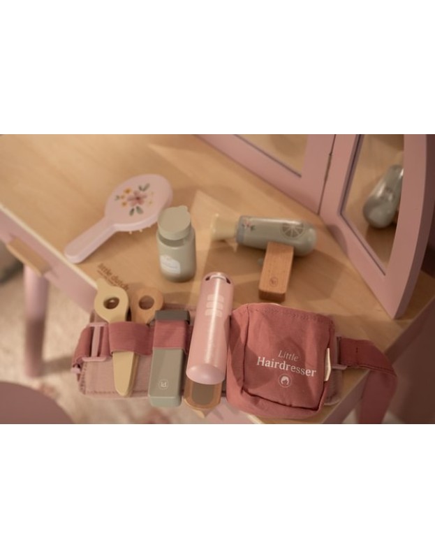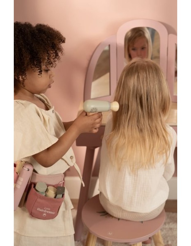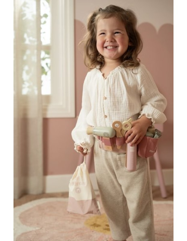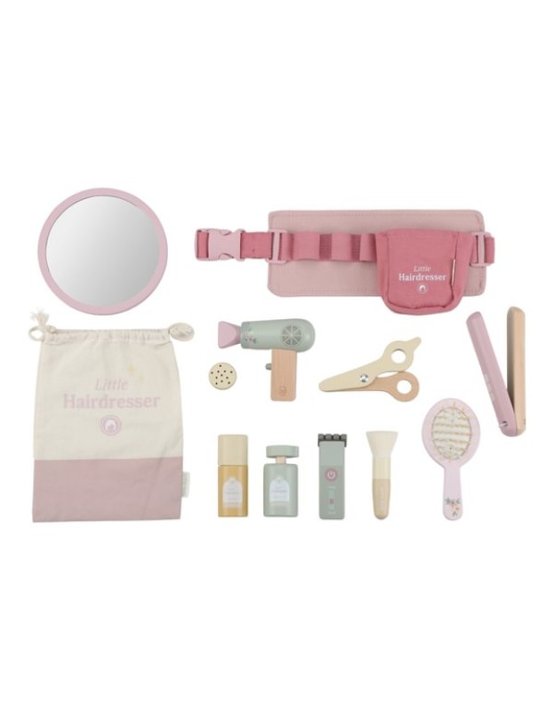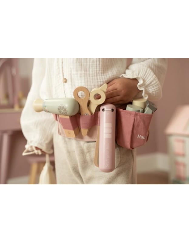 Шишете, фенирајте и стилизирајте како вистински фризер! Прилагодливиот розов појас за колкови е исполнет со професионални додатоци, како што се играчки ножици, фен, пегла за коса, машинка за шишање, четка, шампон, лак за коса и огледало. Совршено за игри со улоги и бескрајна забава. Кој ќе биде првиот што ќе седне на фризерската столица?