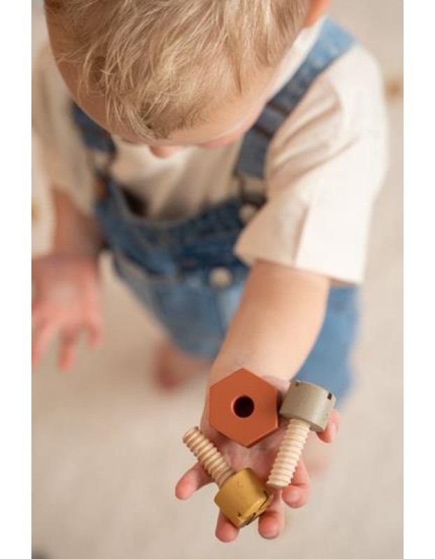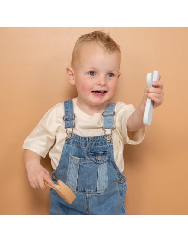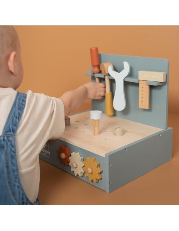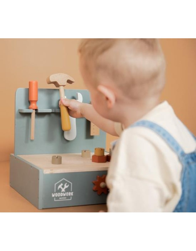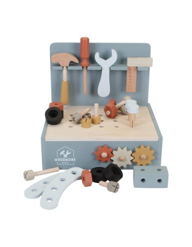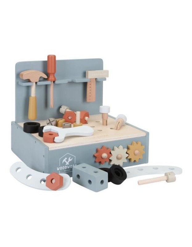 Оваа мини работна маса е компактна и лесна за местење.  Можете да ги користите вклучените завртки за да изградите кул возило. Или пак, едноставно, поправете се што е за поправка во куќата, кујната на мама, столот на тато, а потоа, средете ги алатите и затворете ја дрвената кутија. Користете ја мини работната маса во комбинација со големата работна маса за уште поголема забава во градењето. Сетот мини работна маса содржи 26 компоненти.