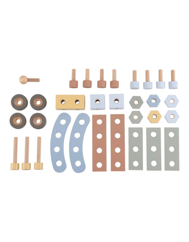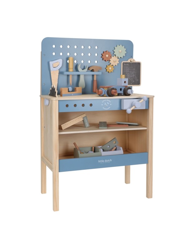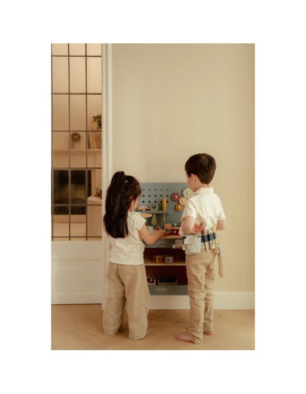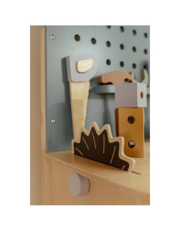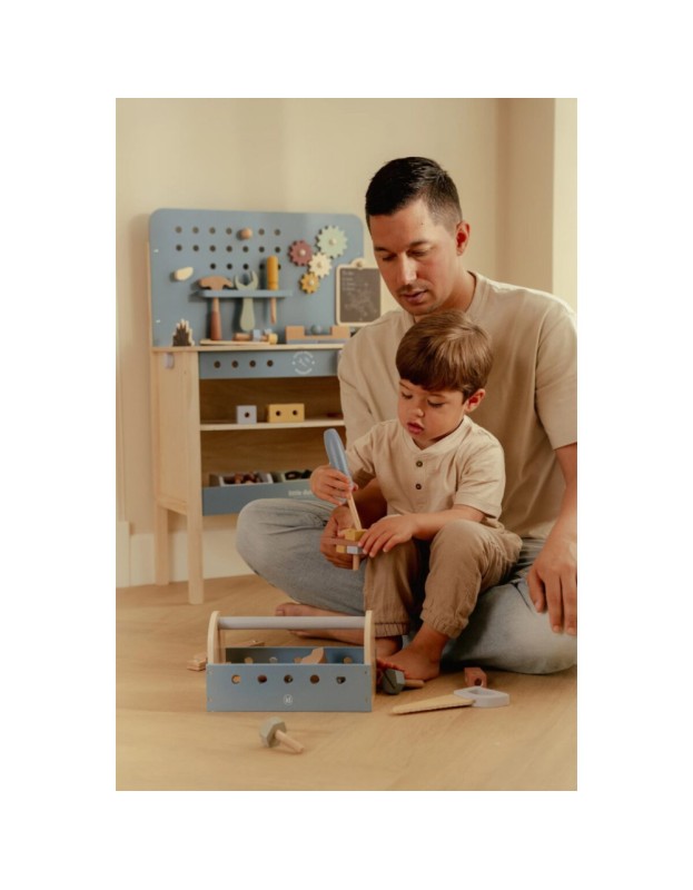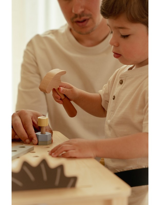 Сè може да се поправи со помош на оваа работилница со алатки. Со вашиот сопствен чекан, шрафцигер и клуч и сите потребни алатки што ви се потребни за да ги изградите, поврзувате и поправате вашите сопствени мали проекти. Постојат делови од панели, навртки и завртки, кои ви овозможуваат да ги навртувате, извртувате и споите работите. Изградете автомобил или своја сопствена креација со едноставно поврзување на делови заедно. Малите деца сакаат да ги копираат своите родители и оваа работна маса им овозможува да создаваат, конструираат и градат предмети, исто како и возрасните!