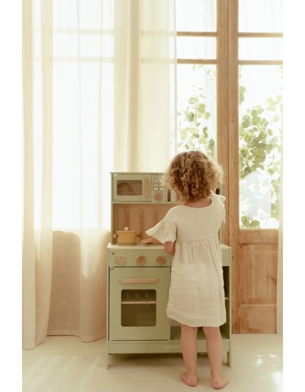 Малите деца сакаат да ги имитираат возрасните и нивните секојдневни рутини. Оваа кујна ќе биде остварување на сонот за малите готвачи. Тоа инспирира игра на улоги, креативност, моторни вештини и имагинација. Цврстата дрвена кујна во модерни бои создава прекрасен простор за игра во детската соба, но ќе изгледа одлично и во дневната соба. Дополнете со вагата за мерење, сетовите на овошје и зелечук за сечење или пак тостерот за уште поголема забава.
